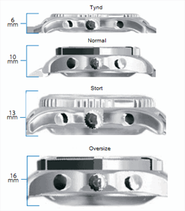 De dikte - of hoogte van het horloge in profiel - wordt aangegeven door het horloge van boven naar beneden te meten zoals hieronder afgebeeld. Ter vergelijking: een munt van 1 euro is 2,33 millimeter dik.